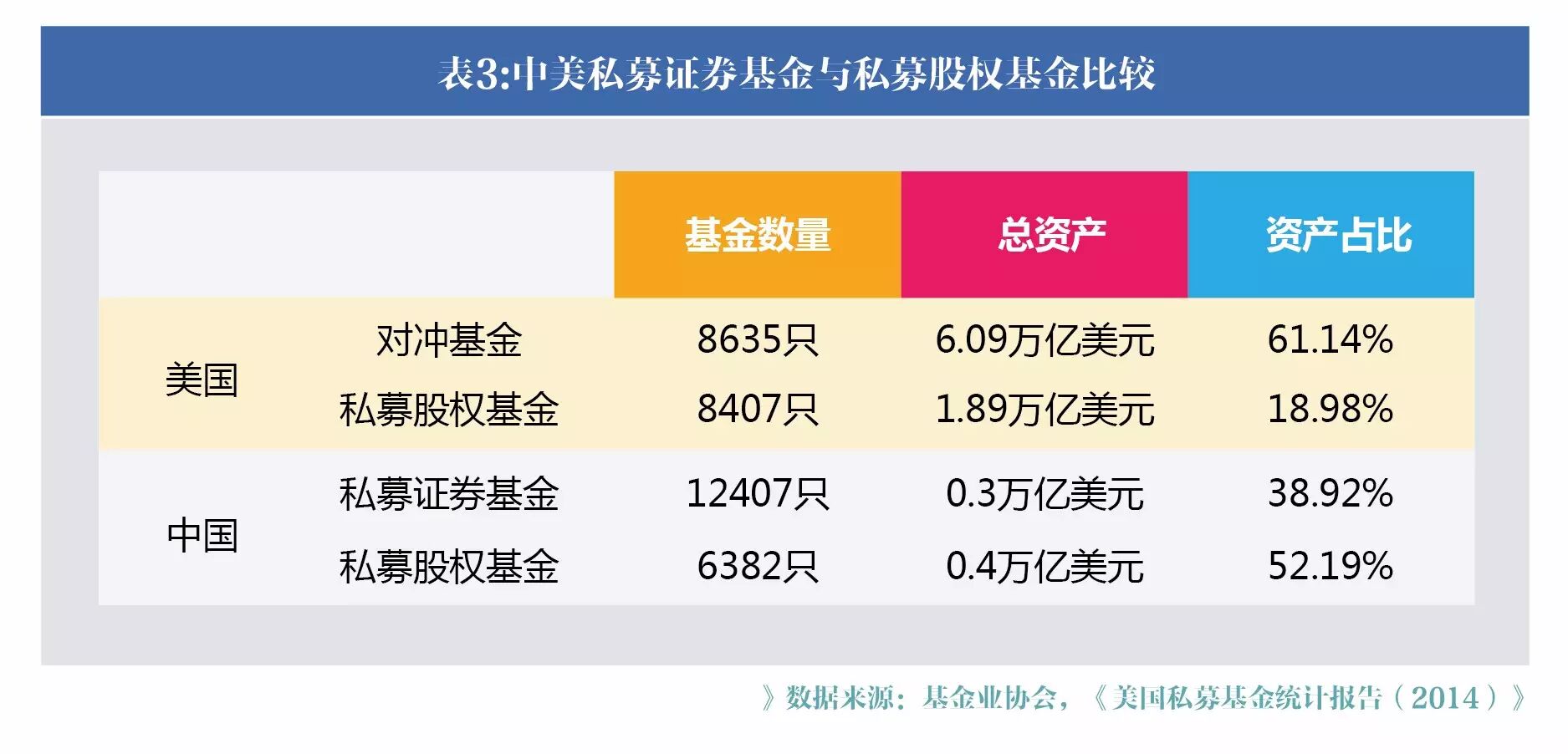 2015年10月16日,美国证监会发布了首份私募基金行业统计报告《美国私募基金统计报告(2014)》,全面反映了美国私募基金行业2013年一季度到2014年四季度的数据信息,也让我们有了管中窥豹的机会。下面,就让我们通过详实的数据,来比较一下中美两国的私募行业发展现状。