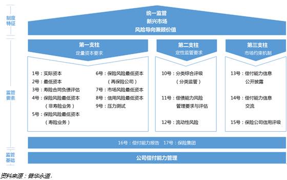 (4)“偿二代”监管框架下设立了三大支柱。与欧盟“Solvency Ⅱ”大体相似,“偿二代”监管框架下也设立了“三大支柱”,第一支柱是定量资本要求,第二支柱是定性监管要求,第三支柱是市场约束机制。定量资本要求注重保险公司偿付能力充足率,即实际资本与最低资本的比例,定性监管要求注重对难以量化风险的评估,市场约束机制强调保险公司偿付能力信息的充分披露。