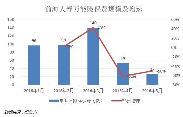 (3)保费收入及政策风险。2016年3月18日,保监会发布《关于规范中短存续期人身保险产品有关事项的通知》,加强对中短存续期产品规模的控制,《通知》要求“存续期限不满1年的中短存续期产品应立即停售,存续期限在1年以上且不满3年的中短存续期产品的销售规模在3年内按照总体限额的90%、70%、50%逐年缩减,3年后控制在总体限额的50%以内”,《通知》发布后,保险行业2016年4月万能险保费环比负增长47%,5月环比负增长37%,其中前海人寿2016年4月和5月万能险保费分别环比负增长62%和50%。