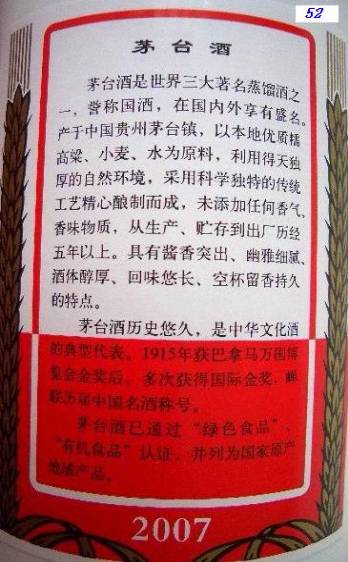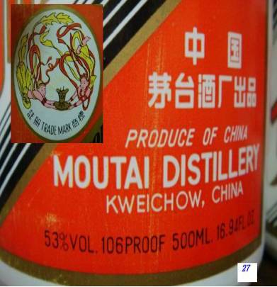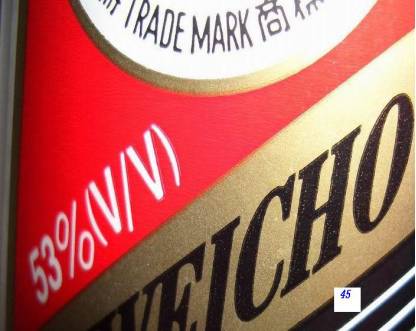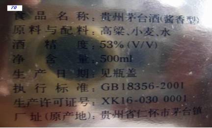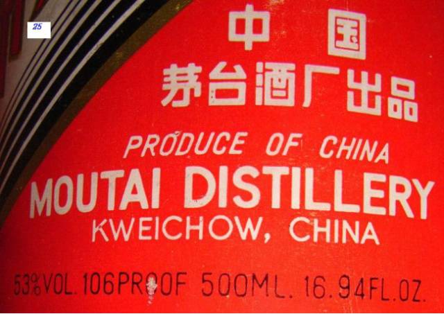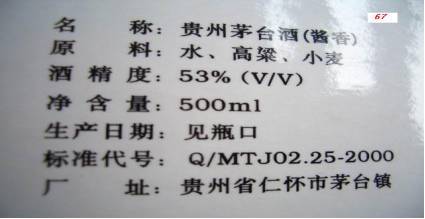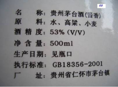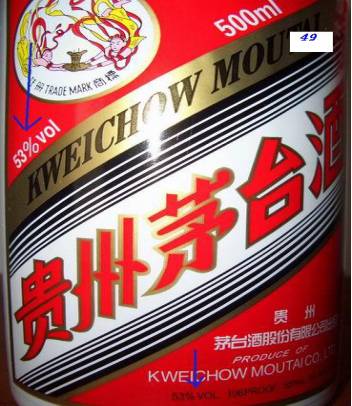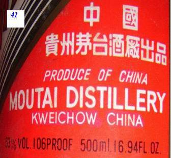 见图41。注意三个地方:厂名“中国贵州茅台酒厂出品”(繁体),酒精度为“53%VOL”(字母大写),容量为“500ml”(字母小写)。