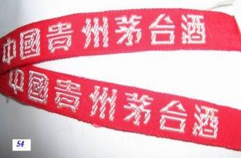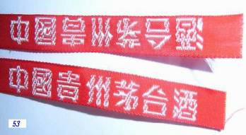 飞天茅台两条红飘带均由电脑刺绣“中国贵州茅台酒”七字,早期两条飘带上七个字阅读方向是不一致的(图53)。1999年起,阅读方向才改为一致(图54)。2004年起,飘带上面织有一个数字(图55)。