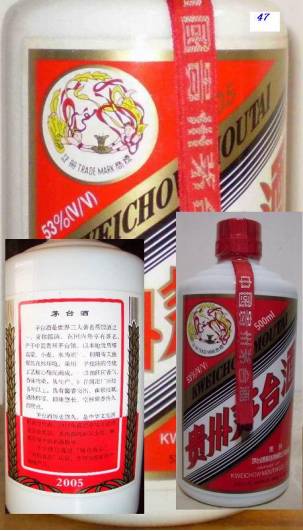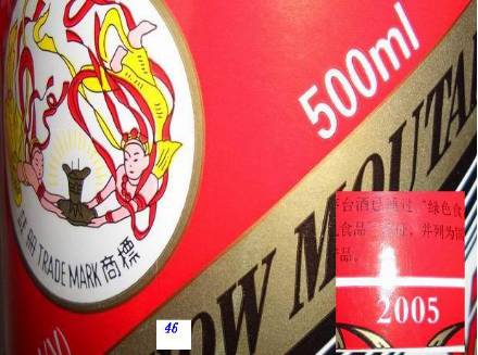 见图46,正标上原来标年份“2005”的位置,改为标“500ml”(字母小写),年份2005标于瓶背。需要注意的是,这个时期“2005” 印于正标和背标的情况可能同时存在(图47)。