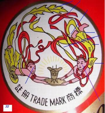 与2001、2002飞天标相比变化主要在于图33中划线部位变为白色。注意,这个标飞天的皮肤仍然有细微的网点状。眼睛和嘴巴不是小椭圆孔了,是小线条,显得比较斯文。