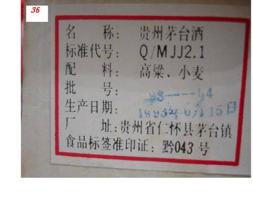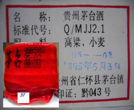 在1995年2月21日到1996年3月24日之间生产的飞天茅台,生产日期同时标于两个地方,既标在标签上,也用喷码标在瓶盖上(图37)。