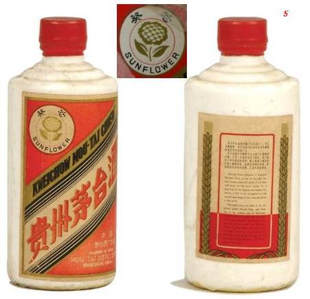 “**”开始后,1967年4月21日革命群众组织“夺权”,10月成立“贵州省茅台酒厂革命委员会”。在此之后的某个时间,外销茅台改用“葵花牌”(图5)。