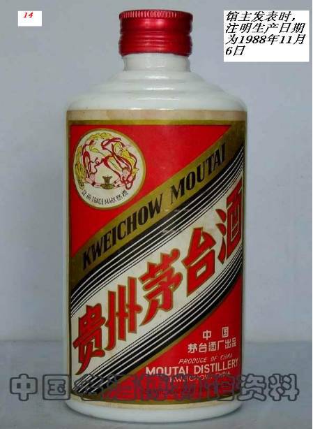 (3)500ML铝盖无飘带飞天茅台开始于1987年3月,结束于1988年或1989年(取决于有无以下“铝盖有飘带”这个产品)。中国名酒博物馆收藏有这个品种,并且明确注明生产日期为1988年11月6日(图14)。日期注述如此具体,以名博馆主严谨的作风,说明他是充分依据的(见过该酒装箱单上的生产日期),否则,生产日期顶多也就注为产于1988年,不会具体到月和日。