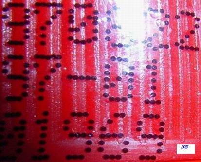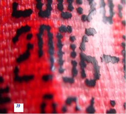 在多倍放大的情况下观察,真品茅台的喷码,落点干脆、边缘圆润、色料饱满(图38)。图39是一种假冒茅台的喷码。