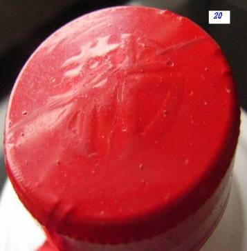 4、瓶盖封口。封胶把飘带和瓶盖绷得特别紧。红色封胶与后来九十年代的封胶比,稍鲜亮、光滑一点、无气泡(图19)。盖顶中间稍凸起,有“茅台”两字(图20)。注意,无“茅台”两字肯定有问题。