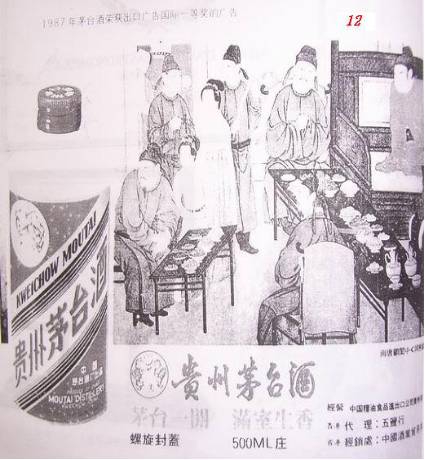 第三,1987年茅台酒参加第三届国际广告大会获得出口广告一等奖的平面广告(图12),图案是500ML铝盖无飘带飞天茅台,广告重点宣传“螺旋封盖500ML庄”,说明“螺旋封盖500ML庄”是当时外销的最主要产品,由此可见《茅台酒厂志》大事记所述“1987年3月‘飞天牌’茅台酒瓶盖防盗式扭断盖正式投入使用”是正确的。