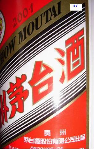 见图44。厂名开始标示为:“贵州茅台酒股份有限公司出品”。正标上出现了年份2001。