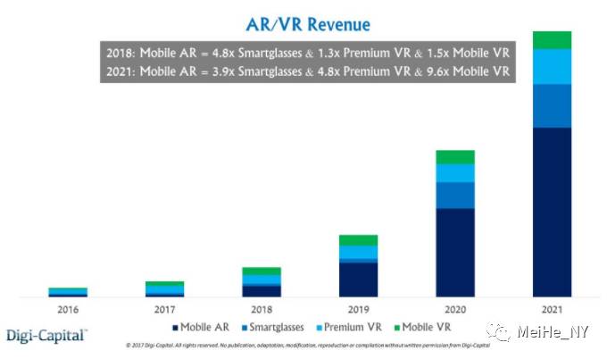 据Digi-Capital预测,到2021年,手机AR的用户数将达30亿,而VR用户只有1亿。手机AR的软硬件收入届时将达600亿美元,是VR市场的3倍以上。AR眼镜从2019年开始商业化,到2021年软硬件收入规模约150亿美元。苹果将是软硬一体化封闭系统的领导者,谷歌将延续安卓的开放路线。Facebook、Snap、腾讯和阿里巴巴等都可能是社交、游戏、电商等领域手机AR软件的领导者。