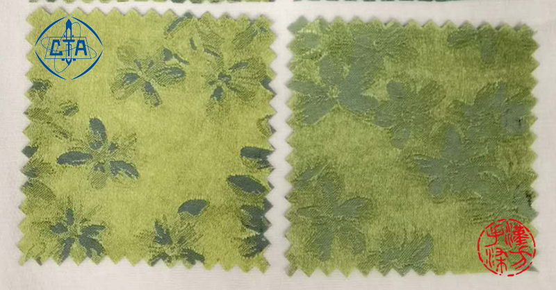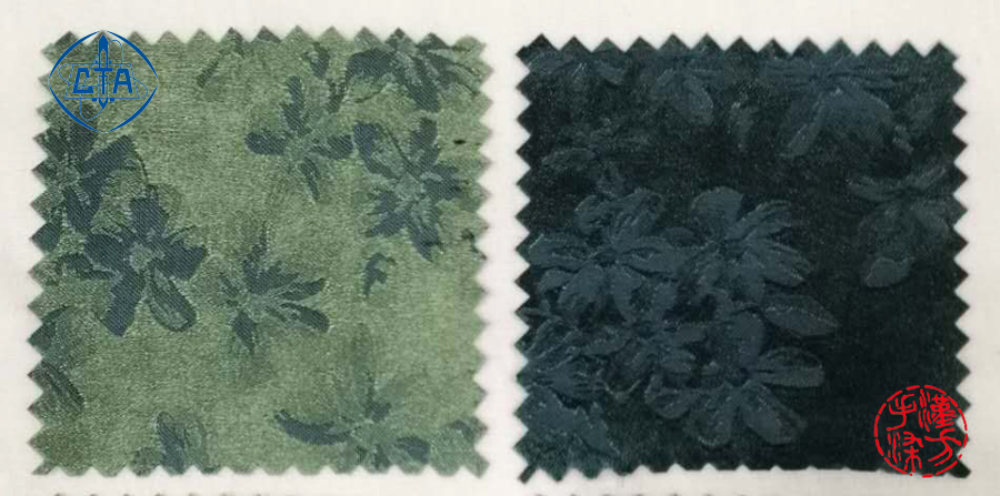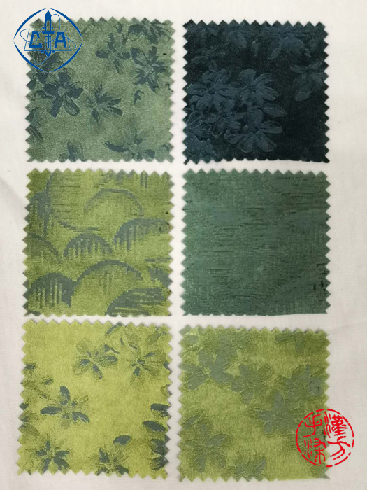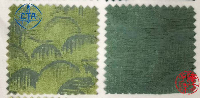 本批希赛尔与桑蚕丝交织提花的面料也是使用的套染方法。形成了多个不同浓度及色阶的绿色。