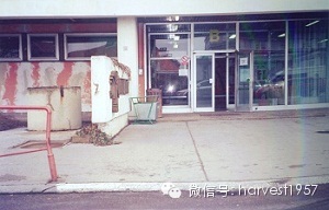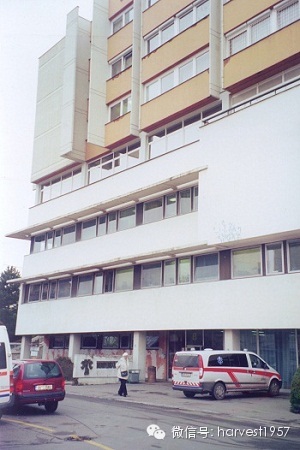 31,2008年摄。1997年,作家去世。这是布拉格利本尼区布洛夫卡医院的住院部大门。作家从五层窗口坠下,就落在门口这堵标志矮墙的右侧。