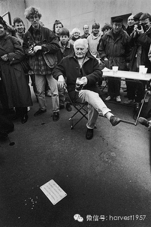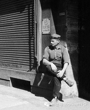 10,1955年摄。工间休息,坐在布拉格新城瓦茨拉夫大街附近焦街10号废纸回收站门前晒太阳。小说代表作《过于喧嚣的孤独》的故事背景,就在这里。