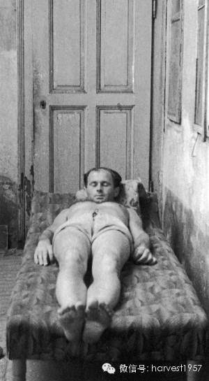 7,1952年摄。在克拉德诺钢铁厂劳动受伤后,躺在布拉格利本尼区堤坝巷24号院子里,装死。