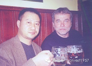 38,2008年摄。在布拉格老城赫拉巴尔经常出没的金虎酒家,赫拉巴尔的忘年交酒友、作家马扎尔和我。