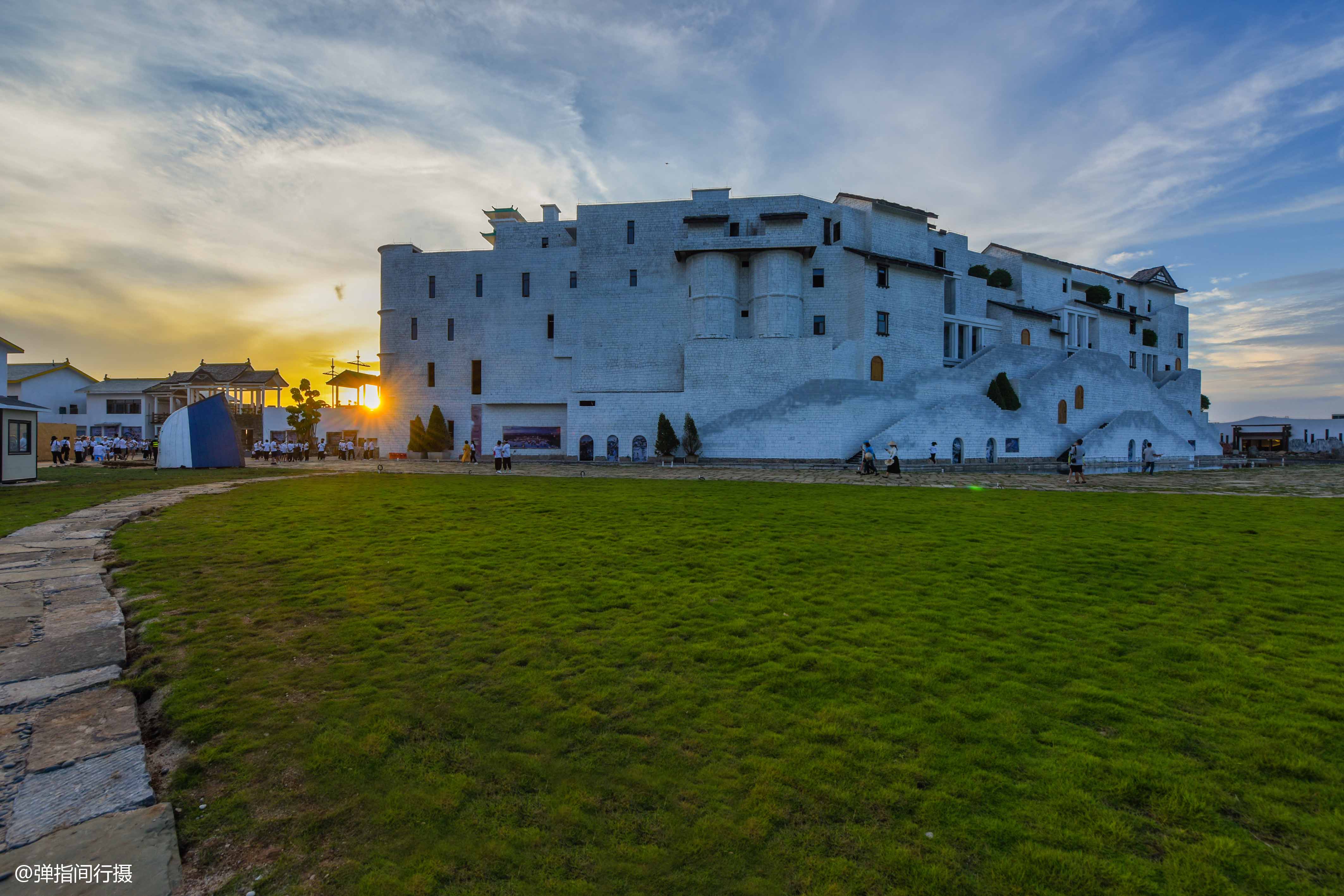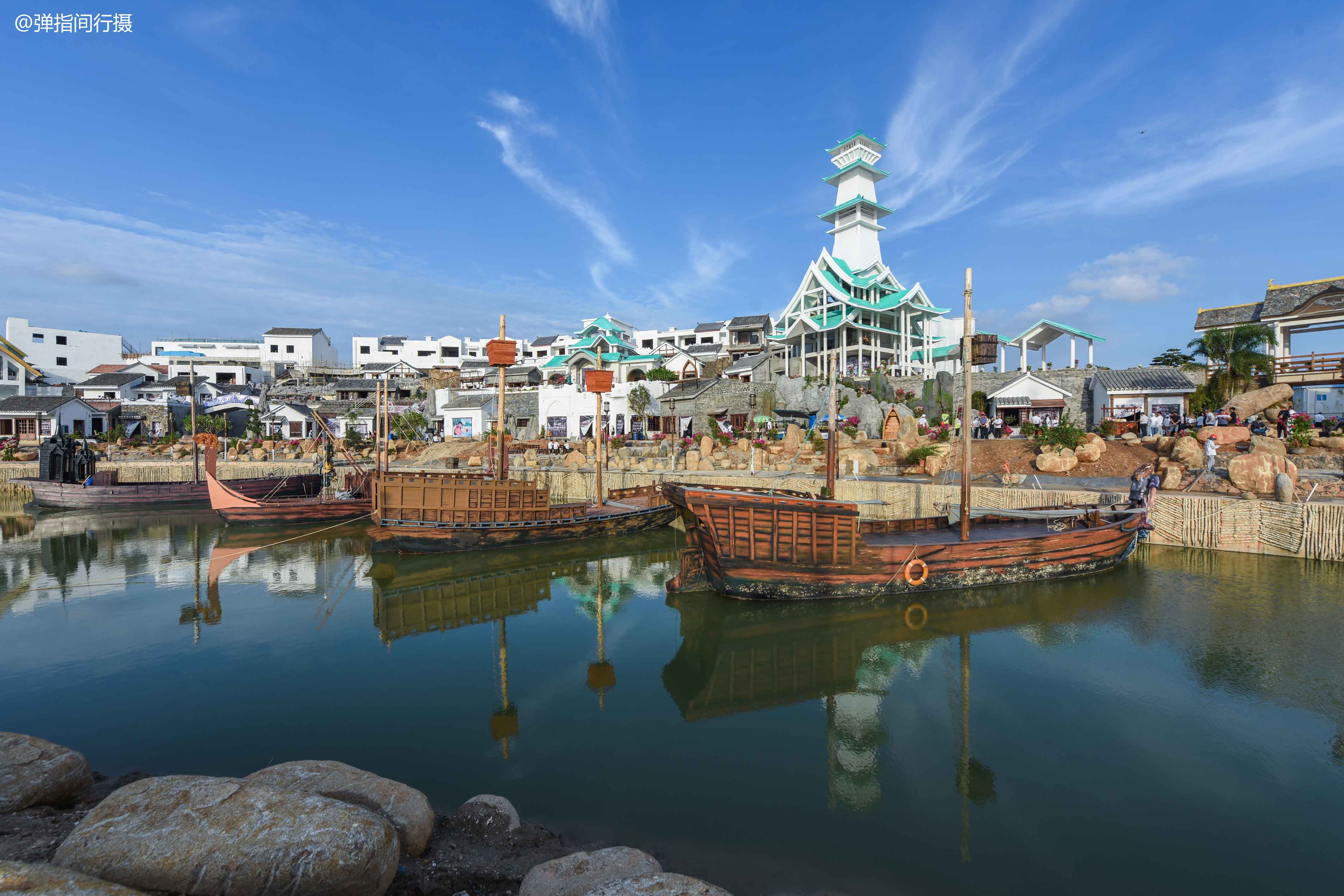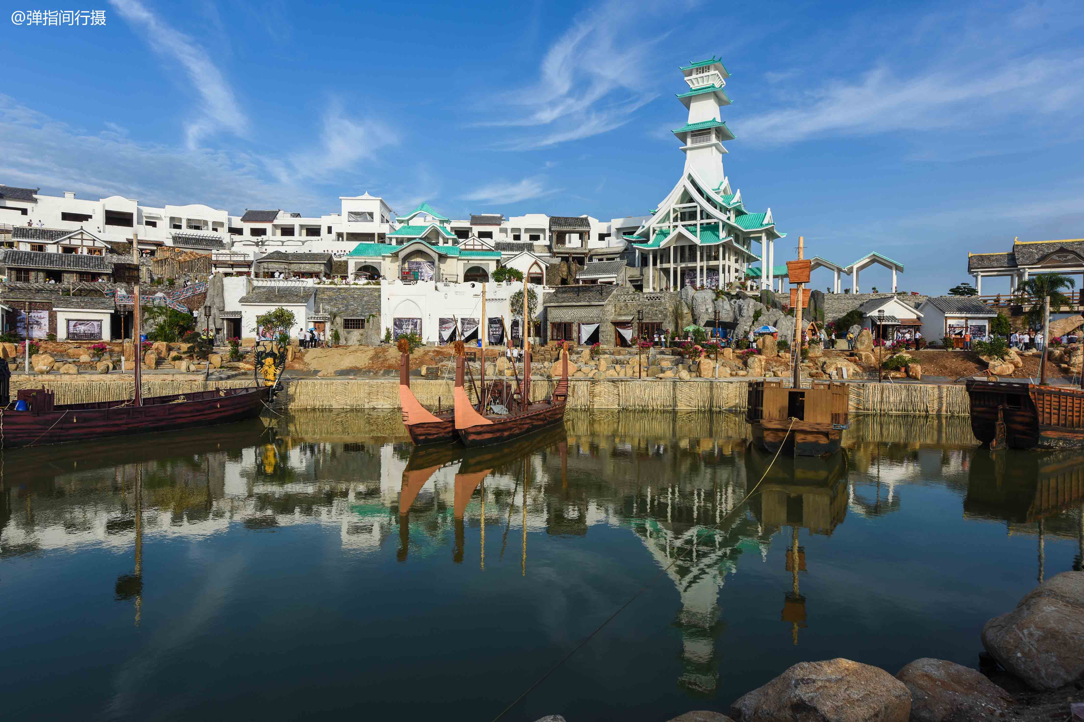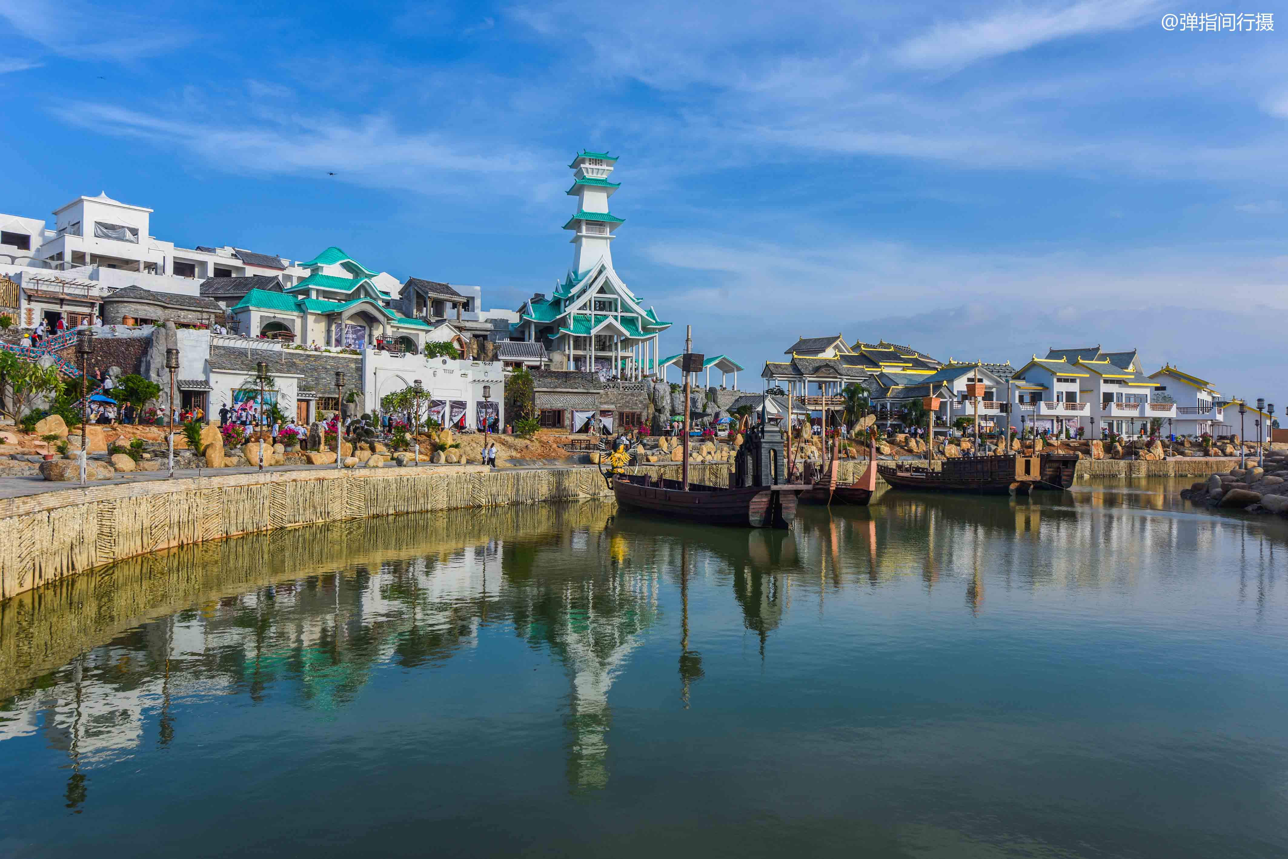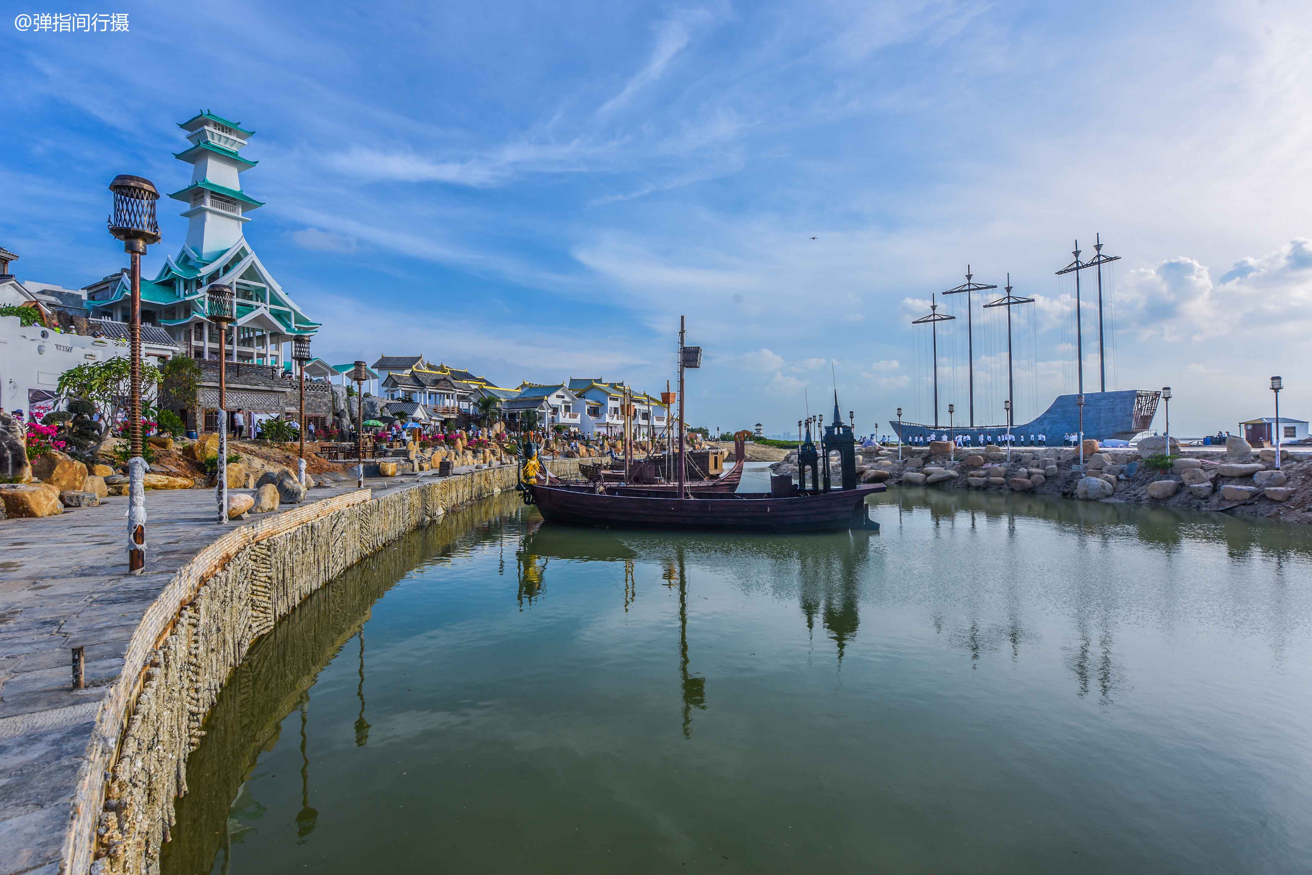 “海丝首港”景区设计独具匠心,运动退台半包裹式建筑布局,呈现出一座高低错落、层次分明的汉代国际码头。景区内建有亭、台、楼、阁、桥、码头等大量汉代风格仿古建筑,把2000多年前的合浦故郡的汉朝风华完美还原,让人仿佛时空穿越,来到历史深处,当一回古人。而穿插其间的多座异域风情建筑,则彰显了汉文化兼容并蓄的大家风范。
