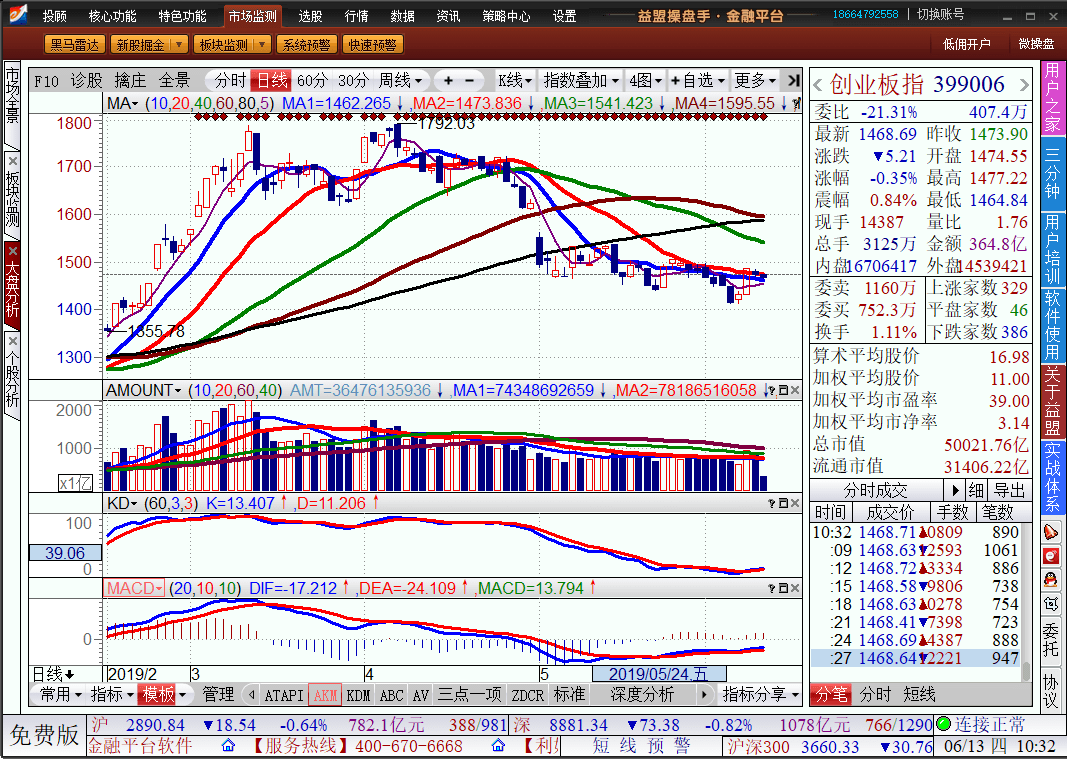4.【双保险应用】60KD仍在20°下方说明弱势依旧,一时难以出现明显趋势的拔高涨势。10MACD维持稳定上扬是因为指数越过20日均线,但必须注意是在0轴线下方,仍有一次压低动作,并非就此可以展开涨势(0分,-20分);