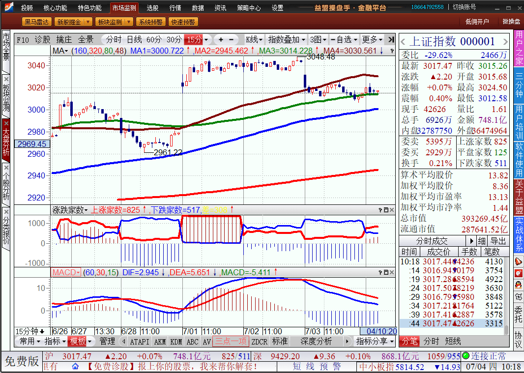 1. 涨跌数量板块比为43:44。数量上形成多空拉锯,但必须注意开盘时偏涨,之后形成多空拉锯,要慎防一旦“下跌家数大于上涨”后就会造成助跌;