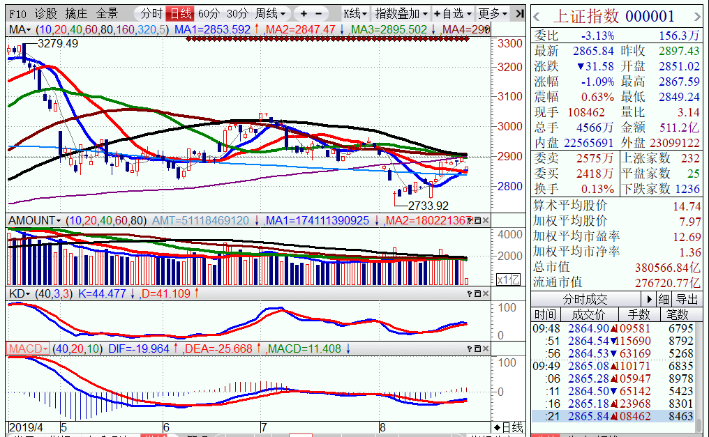 2. 【均线解读】40~60~80日均线集中在2895点,周一的跳空低开证明再度的重挫下跌影响,跌回20日均线正如上周本栏谈到的状况概念一样,价格均线体系对趋势的演绎与看法不变,继续看跌(0分,-30分);