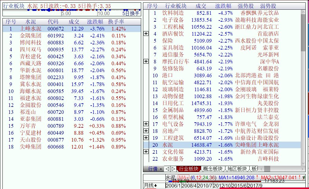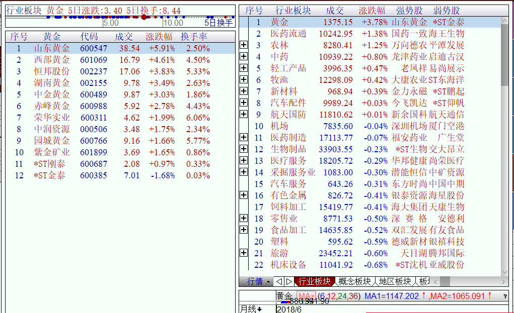 3. 上涨3个板块中黄金板块是典型的“乱世英雄”,越是不稳定消息它越是走强。农林板块被视为对抗不稳定变动消息的炒作特征,逆袭。医药流通板块有点特殊,需要观察。这三个板块无法护守大势,整体大势弱化程度明显,下跌前20个板块助跌在保险、地产,电子设备是人气的象征,所以继续偏弱下跌。