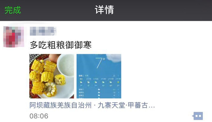 8:06分,第二条,酒店早餐,另一张图是手机天气预报截屏,显示气温7度。