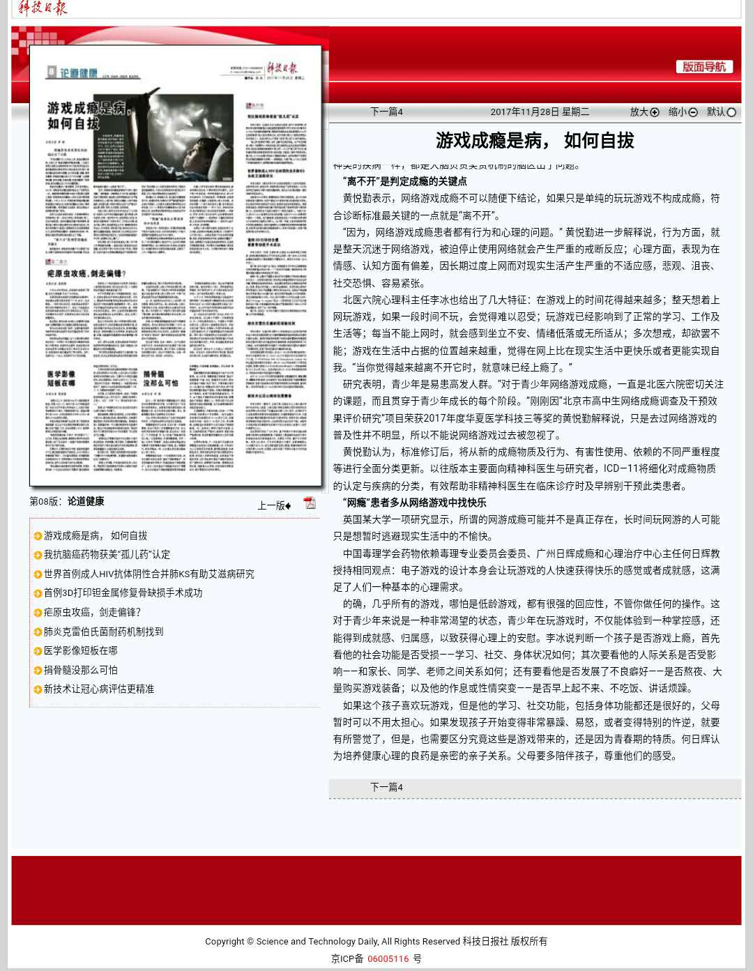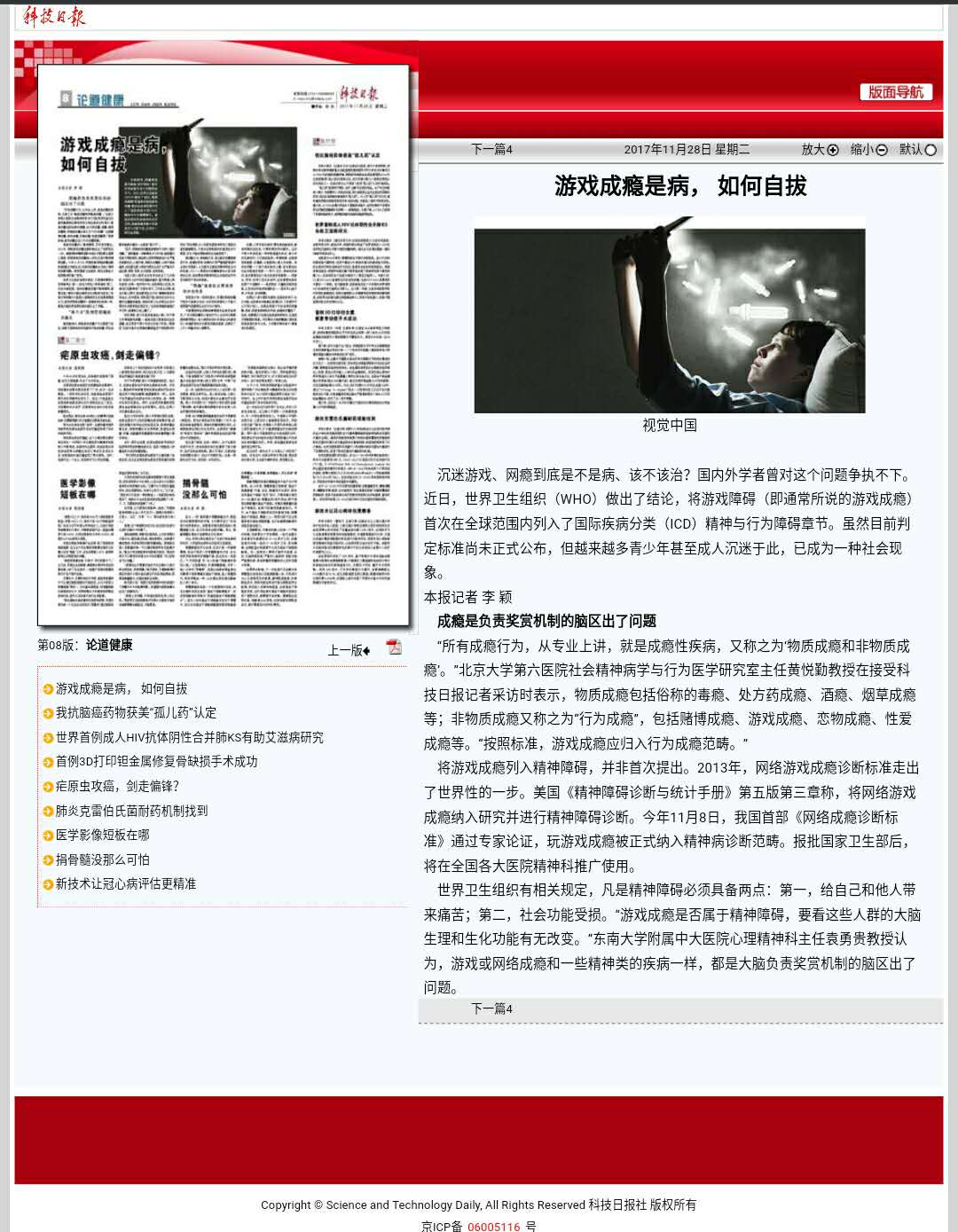 4年前,我国陶然教授提出的网络成瘾诊断标准被美国《精神障碍诊断与统计手册》第五版(DSM-5)收录。虽然,当时是作为提议性质的附录,旨在鼓励进一步研究,而非临床使用;但已足够证明,网络成瘾引起了精神医学学术和临床的重视。
