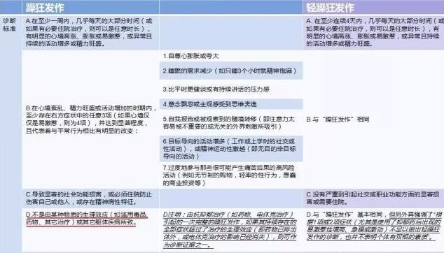 对此,美国精神医学学会《精神障碍诊断与统计手册》(下简称“DSM-5”)中,在双相情感障碍Ⅰ型或Ⅱ型躁狂、轻躁狂的诊断标准处,有明确的定论(见下图)。