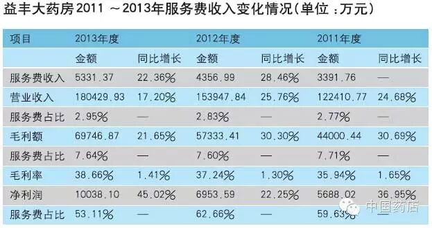 从公开披露的数据看,益丰大药房所收的服务费呈逐年上升趋势,从2011年的3391.76万元、2012年的4356.99万元,增至2013年的5331.37万元,每年均有近千万元的增量。从增幅来看,2012年较上年上涨28.46%,2013年则是同比上涨22.36%。