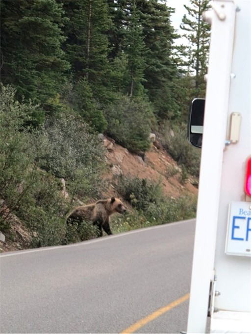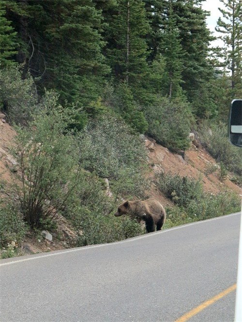 离开MORAINE山谷不到一公里,路被阻隔。竟是两只小熊玩皮地在路边逗趣,天呢天呢,我有多幸运,我的心被这憨态可掬地两个小家伙温暖抚慰,刚才的惊吓被赶得无影无踪。如果没有前面的插曲,我没有机会遇见这两只小熊。这一路如同坐上我从未敢尝试的过山车,上天入地,不是在游乐场,不可控不可知。