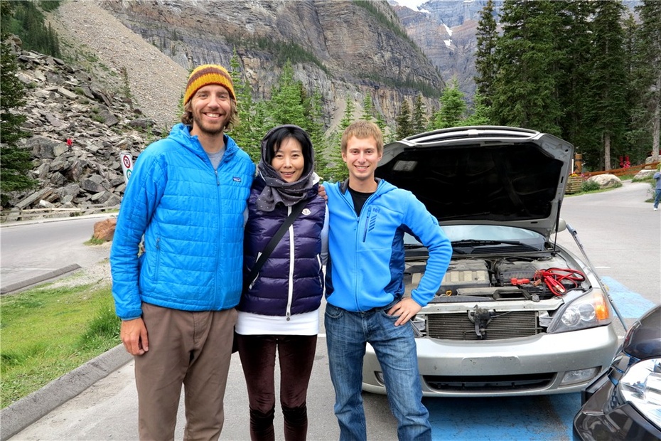 旅行,总会有一些小插曲。在加拿大,开车是要开大灯的,许是景色太诱惑人,迫不及待地去看风景,忘记关车灯,电池被耗尽了。可以想象当我们准备离开MORAINE