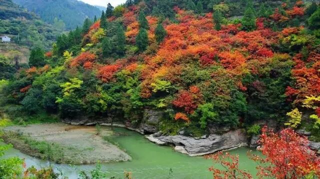深秋漫步于此地,绿色的山峦随意点缀着黄色彩练和各色树叶, 触手可及,就像置身画中。清澈的河流绕村而过,白墙黛瓦的农家乐整齐的排列。