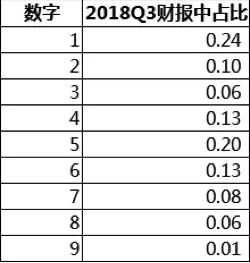 有了分析工具,我们看一下优信提交的Q3财报文件(见https://www.sec.gov/Archives/edgar/data/1729173/000110465918069664/a18-40500_1ex99d1.htm )。根据统计结果显示,1-9的首位出现的次数分别如下图,其中1的出现概率仅为24%,远低于本福特定律中数字1应该出现的频率30%。并且从1到9的数字出现的概率看,并未呈现出递减的关系,出现数字5与数字6的概率过高,出现数字3的概率过低。