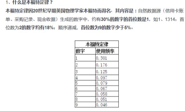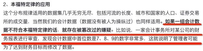 在检测之前,得告知下检测原理与方法。下文拟本福特定律来检测(具体介绍见下图)。根据雪球平台信息介绍(https://xueqiu.com/1830902728/73179402),本福特定律是近来备受资本市场青睐的一种分析财务报告的方法,认可度尚可。最近几年才应用于会计和金融领域:保险公司开始用这种方法检测申报真实性,美国国内税务局用来检测税务申报真实性,四大会计师事务所则用它检测会计数据的真实性。