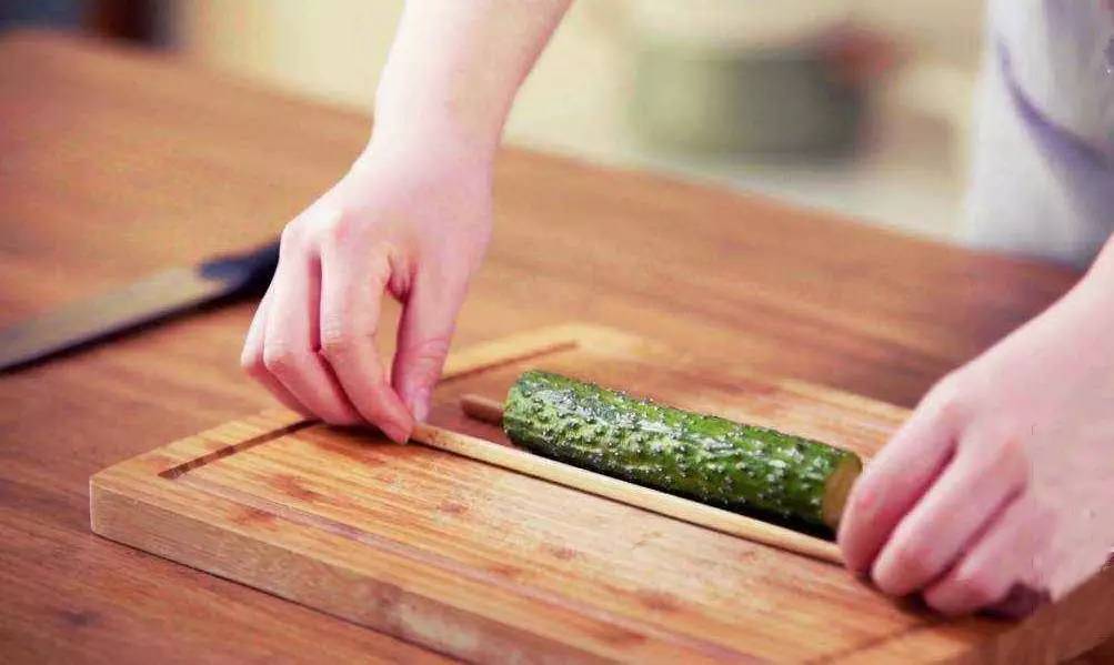 做凉菜的时候,尽可能地将黄瓜蒂切得碎一些,然后和黄瓜一起拌入菜中。