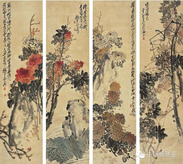 末期还有“三任一吴”,“三任”是任渭长、阜长和伯年,“一吴”是吴昌硕。“三任”的花鸟画,是从陈老莲的花鸟画发展下来的。渭长的笔调比较稳当,阜长、伯年他们的笔调更加泼辣,但是行笔如风、一挥而就的气势,是他们独特的风格,尽管他们有些过分地夸张了笔墨。吴昌硕是从苍老拙厚的笔调上求得画面上的协调,对于形象,却是大胆地加以夸张和剪裁。所谓大笔破墨花卉,成为一时最杰出的作品。