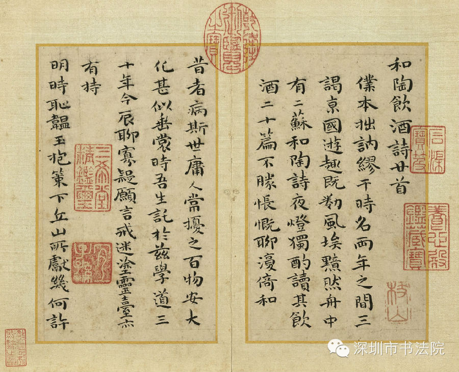 明初书法“一字万同”,“台阁体”盛行。沈度学粲兄弟推波助澜将工稳的小楷推向极致。“凡金版玉册,用之朝廷,藏秘府,颁属国,必命之书”,二沈书法被推为科举楷则。明初书法家有擅行草书的刘基、工小楷的宋潦、精篆隶的宋遂和名满天下的章草名家朱克。和祝允明、文徽明、王宠"三子"。