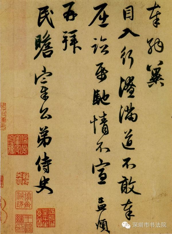 宋朝书法尚意,此乃朱大倡理学所致,意之内涵,包含有四点:一重哲理性,二重书卷气,三重风格化,四重意境表现,同时倡导书法创作中个性化和独创性。这些在书法上有所体现,如果说隋唐五代的尚法,是求“工”的体现,那么到了宋代,书法开始以一种尚意抒情的新面目出现在世人面前。这就是要墀书家除了具有“天然”、“工夫”两个层次外,还需具有“学识”即“书卷气”,北宋四家一改唐楷面貌,直接晋帖行书遗风。