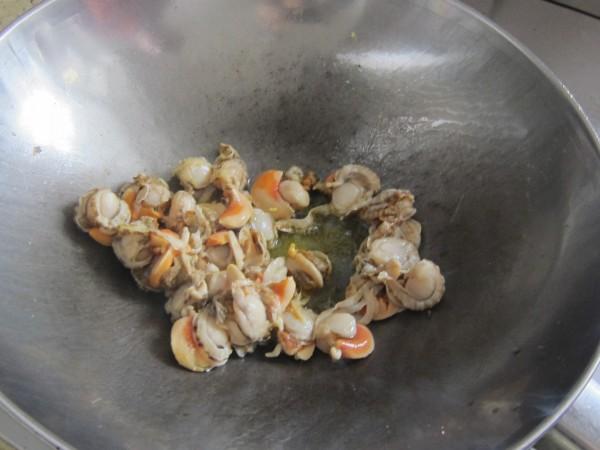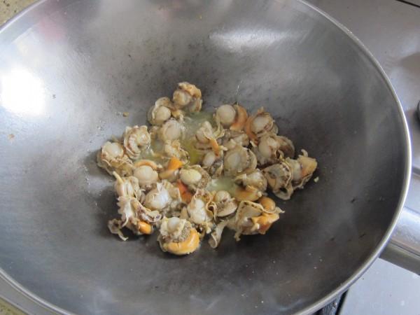 6,锅里有点底油,直接把扇贝放进锅里大火翻炒,加一勺料酒。