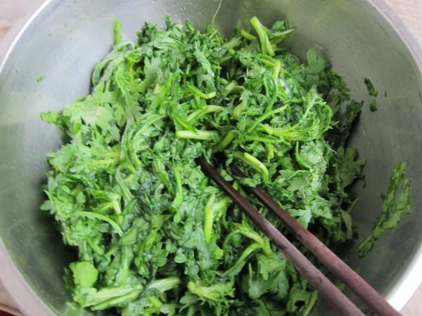 食材;茼蒿适量,面粉适量,盐一勺,橄榄油适量,辣椒油适量,大蒜适量。放你喜欢的佐料。