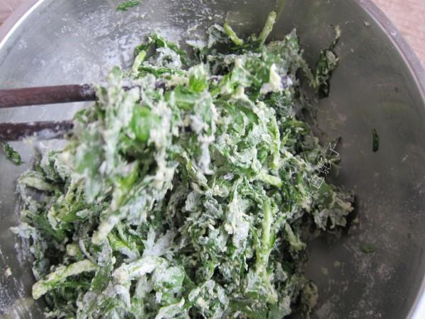 5,因为菜的水分被盐腌出来了,所以不用加水啊。直接拌面就行了,面粉已经把菜包裹住了。