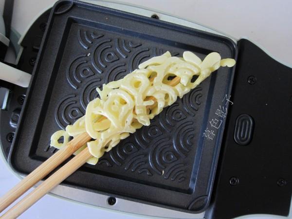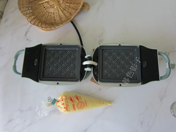 8,把蛋糊,装进裱花袋。预热一下三明治机,将机器展放到平摊位置。
