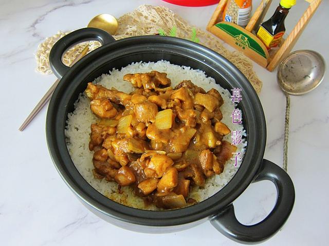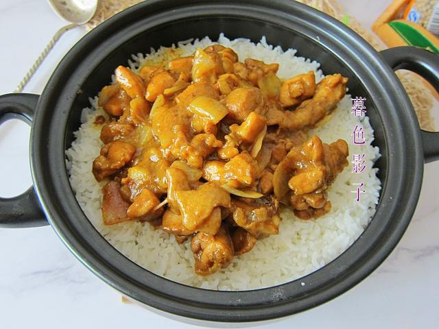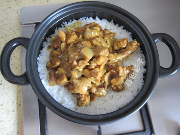 8,煮开锅的咖喱鸡肉倒进米饭锅里。开吃吧美滋滋的味道呐。
