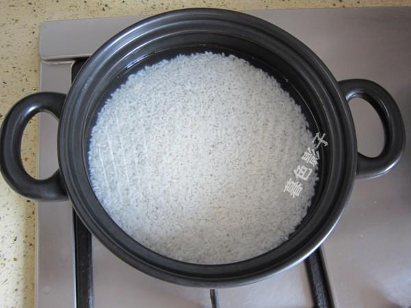 2,大米淘洗干净,加适量的水,倒进煲饭的锅子里边。