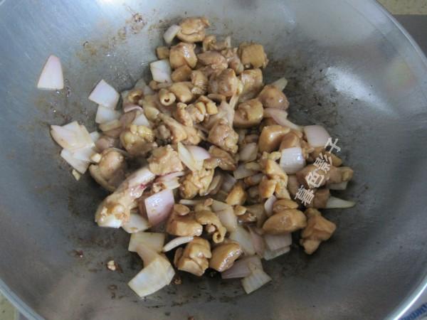 制作步骤;1,将鸡肉和圆葱都切成小丁,用腌料腌制20分钟左右入味。