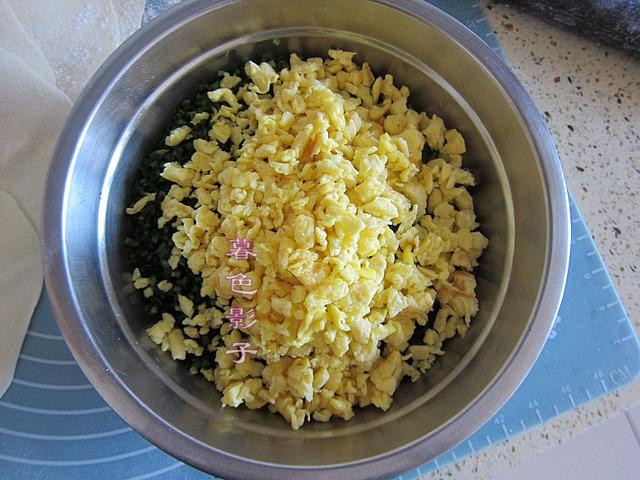 6,重点说拌馅了。韭菜馅料先放的油拌的是保护韭菜的水分的,现在要包馅了,放盐和虾皮鸡蛋一起拌拌就可以包馅了