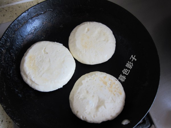 6,平底锅烧热了,按压好的 饼子放在锅里,烙一下双面。