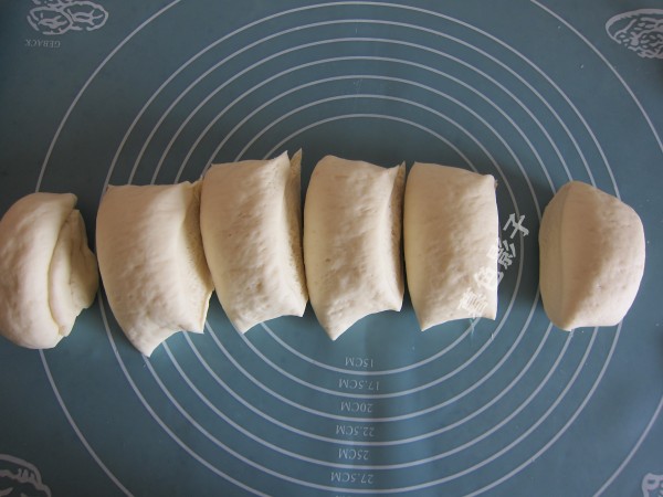 4,把发酵好的面团放案板上揉搓排气。大面胚要分成大小一致的小面胚。记得要揉面,面团一定要保湿,揉成圆形做饼的面团。