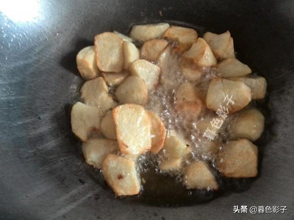3,冷油下锅炸土豆块,不断的翻动一下,炸的色泽金黄就可以捞出来备用。