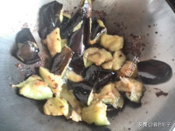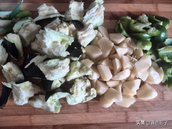 2,茄子最好不要用刀切,用手掰成块。土豆用刀别一下一块一块的,大辣椒用手掰开,其实道理是一样的,这样做的菜好吃,这样没有铁锈味道。